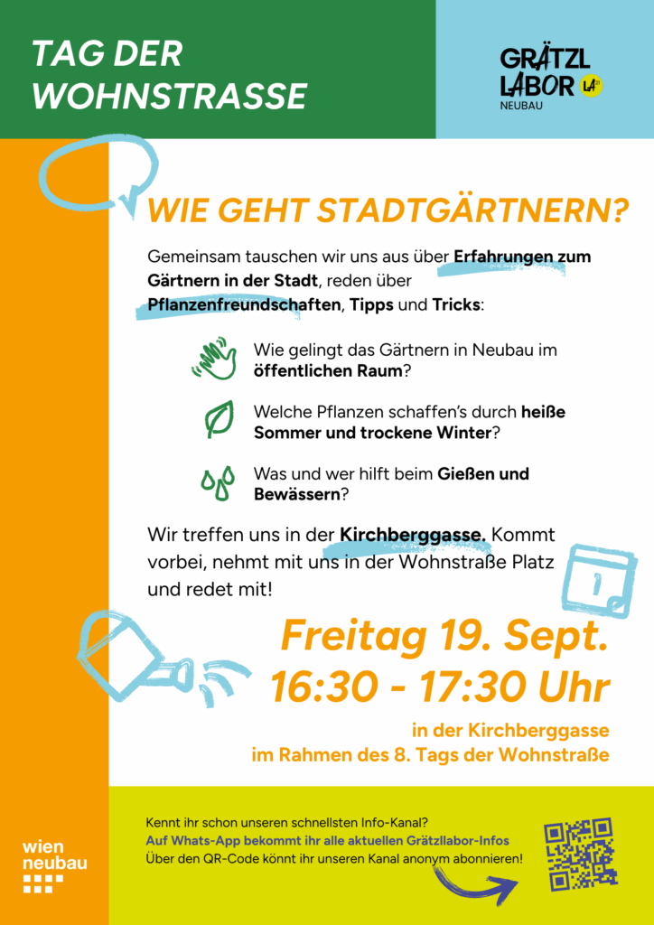 16:30–17:30 Uhr | Wie geht Stadtgärtnern? – Erfahrungsaustausch zum Gärtnern in der Stadt, Pflanzenfreundschaften, Tipps und Tricks: Wie gelingt das Gärtnern in Neubau im öffentlichen Raum? Welche Pflanzen schaffen heiße Sommer und trockene Winter? Was hilft beim Gießen und Bewässern? organisiert vom Grätzllabor Neubau |