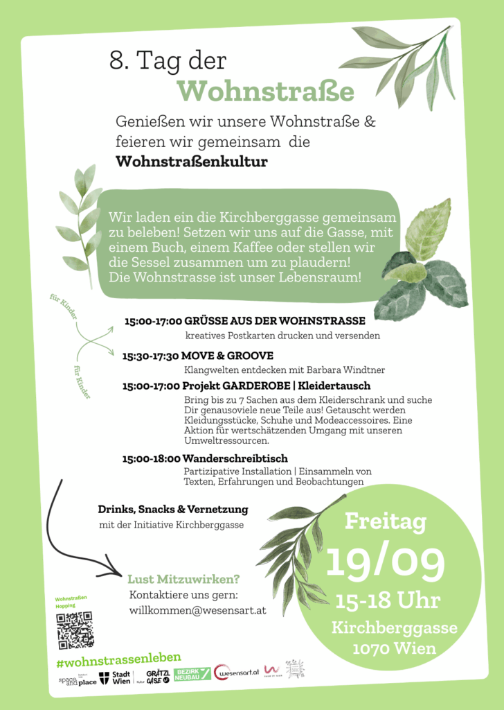 Am Freitag, den 19. September 2025, verwandelt sich die Kirchberggasse in eine bunte, lebendige Begegnungszone. Beim 8. Tag der Wohnstraße feiern wir unsere Wohnstraße und die gemeinsame Wohnstraßenkultur. Kommt vorbei, tauscht euch aus und genießt einen Tag voller Aktivitäten, Informationen und Geselligkeit.